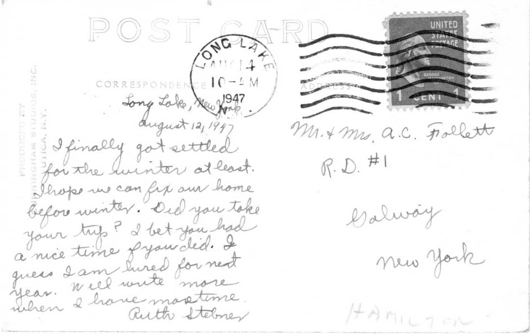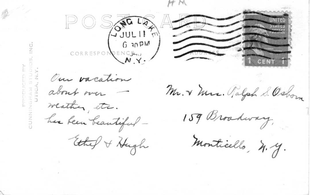 See this short, 13 page, travel booklet about Long Lake, NY. The booklet, shared in PDF form, featuresviews of the lake and townAutomobile map of AdirondacksLink: Long Lake Travel Booklet Front of postcard showing Long Lake Town Hall. Mailed August of 1947. Back of postcard, front image shows Long Lake High School. Mailed July, in the 1940’s Front of postcard showing Long Lake High School. Sent during month of July in the 1940’s. Back of postcard, front image shows Long Lake Town Hall. Mailed August of 1947.