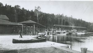 After the Civil War, the tourist business became big business. From the 250-guest Sagamore Hotel on Long Lake and the 200-guest Antlers on Raquette to small hotels scattered throughout the woods, local folks found work. There was even more work for men to work seasonally as guides or provide game and vegetables for the hotels. A few became known nationally as builders of the elegant guideboats seen on streams and lakes throughout the region. Others, mostly anonymous, created the rustic style, which was incorporated in seasonal homes large and small. Rustic mansions, known now as “great camps,” first appeared on Raquette Lake in the 1870s. The Town became connected to the wider world—first by people traveling the region’s major waterway, the Raquette River, of which the lakes are part.